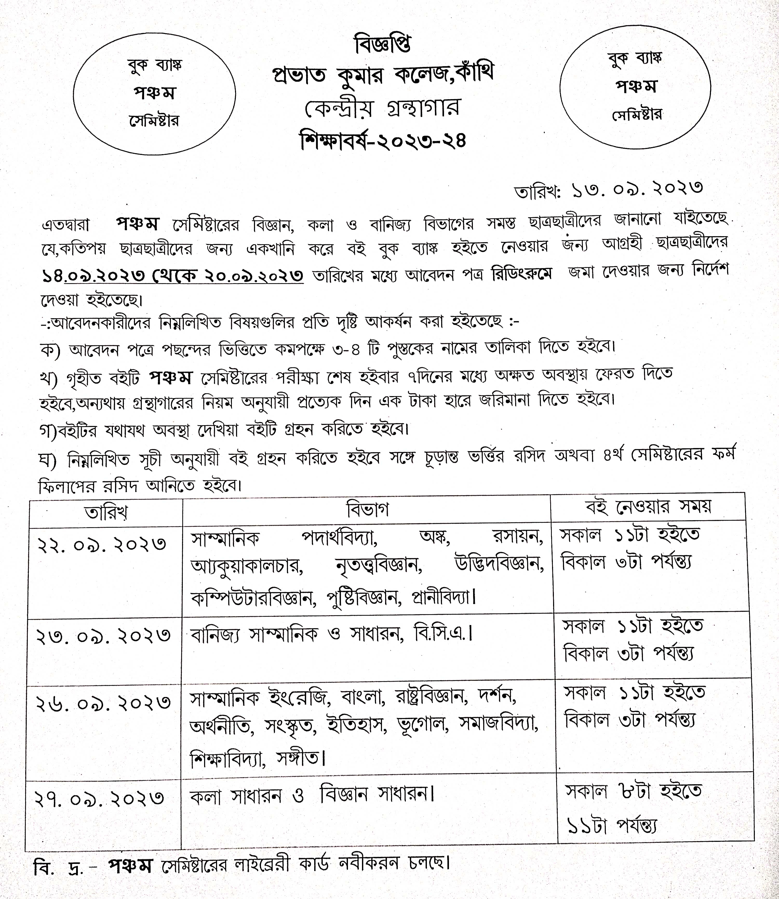 Thursday, September13, 2023 Notification for issuing of books for UG 5th semester students from the Central Library