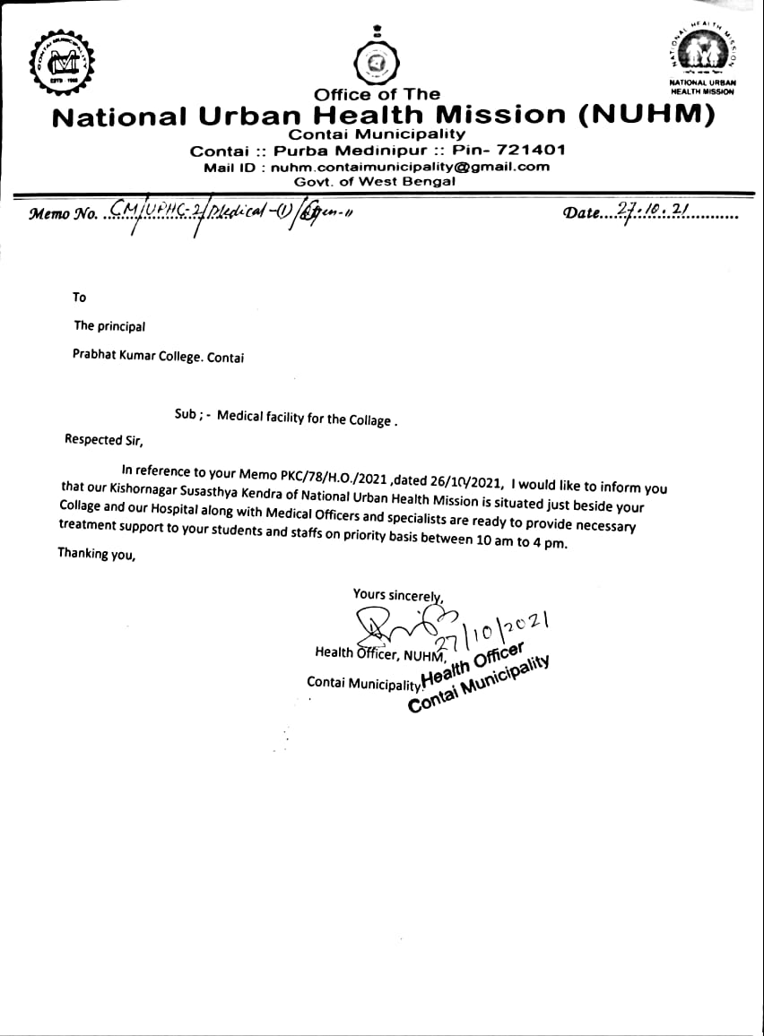 Instead, we have an agreement with the Local Health Centre at Central Bus-stand under NUHM (National Urban Health Mission) to provide necessary treatment support to our students and staff of the institute on priority basis, vide Memo no PKC/78/H.O./2021, dtd. 26.10.2021.